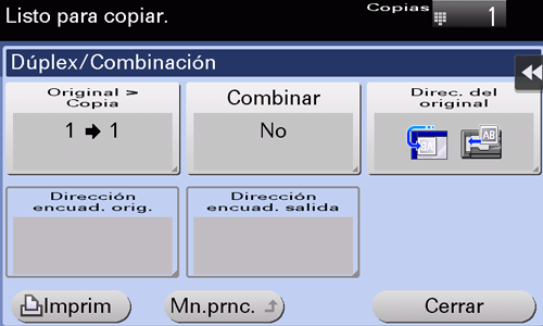 [Original > Copia] | Seleccione una combinación del original que va a cargarse (original de 1 cara u original de 2 caras) y el método de copia (copia de 1 cara o copia de 2 caras). Para escanear un original de 2 caras, indique si está encuadernado en la parte superior, izquierda o derecha en [Dirección encuad. orig.] Para realizar una copia en las 2 caras de las hojas de papel, especifique la encuadernación en la parte superior, izquierda o derecha en [Dirección encuad. salida]. |