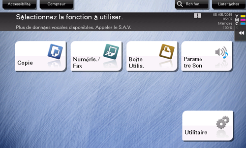 1 | Touches du menu principal | Affiche les touches raccourcis assignées aux fonctions. Les touches de raccourci peuvent être personnalisées selon vos besoins. Par défaut, [Copie], [Numéris./Fax], [Boîte Utilis.], [Paramètre Son] et [Utilitaire] sont placés dans le menu principal. ([Utilitaire] est fixe.)