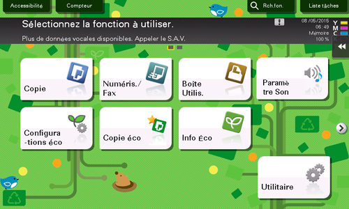 Lorsqu'une des fonctions [Configura -tions éco], [Copie éco] ou [Info Éco] figure dans le menu principal, le fond du menu principal devient celui de la fonction Eco.