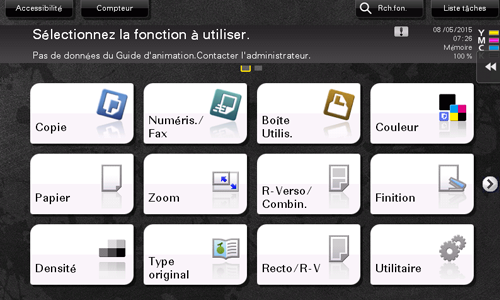2 | [Accessibilité] | Tapez sur ce bouton pour régler une position d'effleurement de l'Écran tactile changer les sons des touches et configurer l'environnement d'exploitation du Panneau de contrôle.
