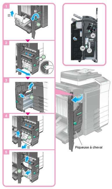 Les sections dans l'Unité de finition qui sont sujettes aux bourrages papier varient en fonction des réglages définis pour [Finition].