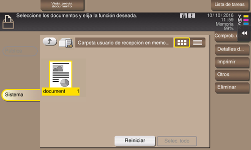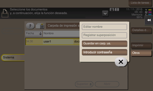 Si [Funciones prohibidas si falla la autenticación] se ha ajustado a [Modo 2], se debe introducir la contraseña para seleccionar un archivo de la carpeta de usuario de impresión segura. Es preciso introducir la contraseña de cada archivo incluso aunque los documentos seguros tengan el mismo ID de documento. Por lo tanto, el nivel de seguridad es superior al del [Modo 1] predeterminado. Para obtener más información sobre [Funciones prohibidas si falla la autenticación], consulte [Funciones prohibidas si falla la autenticación] .