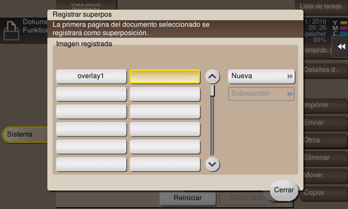 Para registrar un imagen de superposición sobrescribiendo una existente, seleccione la tecla registrada y toque [Sobrescribir].