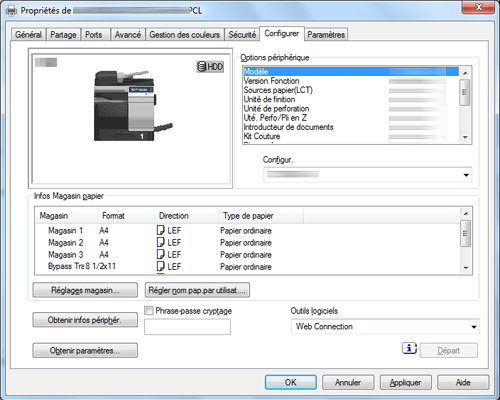Par défaut, [Auto] dans [Obtenir paramètres...] est activé. Les informations sur cette machine sont automatiquement obtenues et sont restituées dans [Options périphérique].