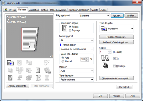 Le pilote d'imprimante est doté d'une fonction qui permet d'enregistrer les réglages favoris. Pour plus de détails, voir [Enregistrer des réglages d'impression fréquemment utilisés] .