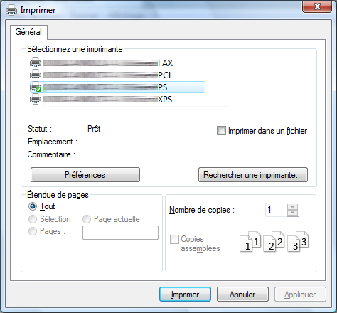 La boîte de dialogue [Imprimer] varie en fonction de l'application.Spécifiez l'étendue des pages et le nombre d'exemplaires à imprimer.