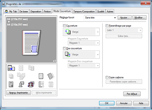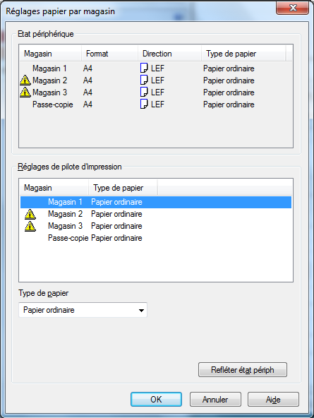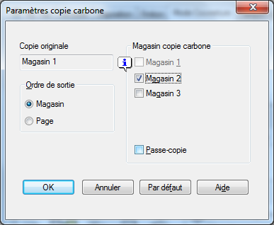 [Magasin] : Les copies carbone sont imprimées dans l'ordre des magasins sélectionnés. Quand on imprime un original de plusieurs pages, toutes les pages sont imprimées sur le papier d'un magasin, puis c'est le deuxième magasin qui est utilisé.