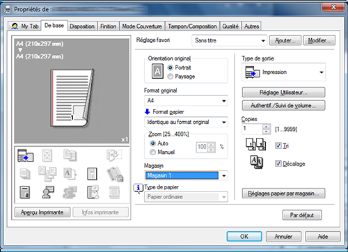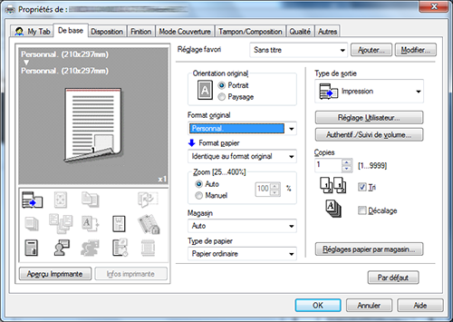 Dans [Format papier] dans l'onglet [De base], sélectionnez le format de papier pour l'impression. Le taux de zoom est automatiquement déterminé par les formats de papier sélectionnés dans [Format original] et [Format papier].