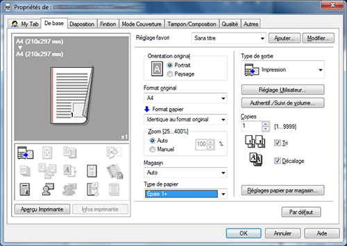 Dans [Type de papier] de l'onglet [De base], sélectionnez le type de papier d'impression. Cette fonction est activée quand [Magasin] est réglé sur [Auto].