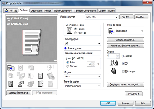 Avant d'imprimer un grand nombre de copies, utilisez la fonction Impression épreuve pour éviter d'imprimer par erreur un grand nombre de copies et de gaspiller du papier. Pour plus de détails, voir [Effectuer un essai d'impression (Impress. épreuve) ] .