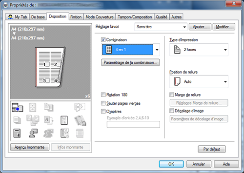 Dans [Combinaison] sous l'onglet [Disposition], sélectionnez "N en 1". Par exemple, lorsque vous sélectionnez [9 en 1], chaque jeu de neuf pages est réduit puis imprimé sur la même face de la feuille.