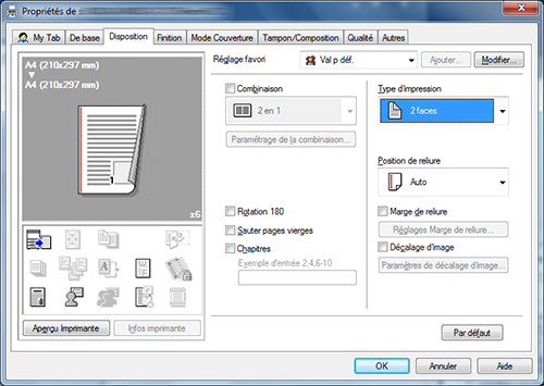 Dans [Type d'impression] de l'onglet [Disposition], sélectionnez [2 faces]. [2 faces] est spécifié par défaut.