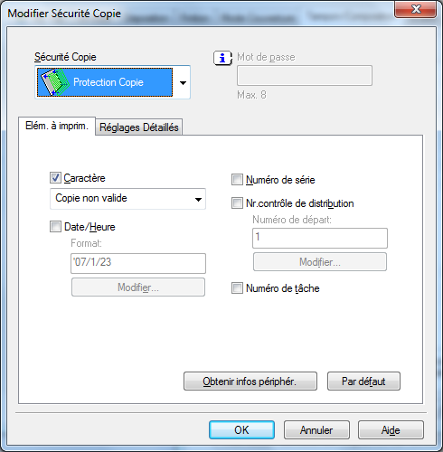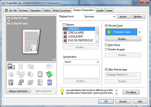 Sur l'onglet [Tampon/Composition], cochez la case [Sécurité Copie], puis sélectionnez [Protection Copie].
