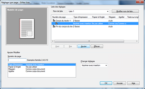 Créez à l'avance une liste qui spécifie les réglages papier et d'impression pour chaque page. Lorsque vous imprimez sur du papier inséré, sélectionnez la liste que vous voulez appliquer à l'impression.
