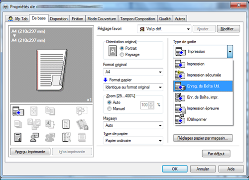 Dans [Type de sortie] dans l'onglet [De base], sélectionnez [Enreg. ds Boîte Util.]