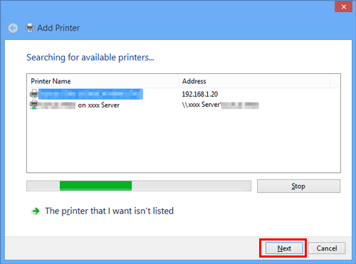 Dans la fenêtre affichant l'imprimante détectée, cliquez sur [L'imprimante voulue n'est pas dans la liste].