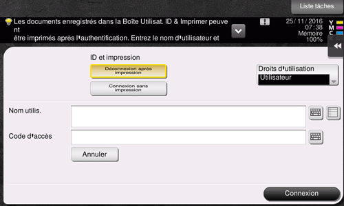 Vérifiez d'avoir bien sélectionné [Déconnexion après impression] dans [ID et impression] et appuyez sur [Connexion].