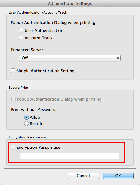 Cochez la case [Encryption Passphrase:] et entrez la phrase-code de cryptage (avec 20 caractères alphanumériques max., symboles compris) que vous avez définie sur cette machine.