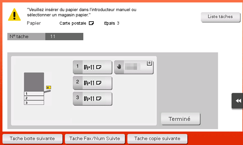 Si vous ne pouvez pas taper sur [Terminé], vérifiez que le réglage papier du pilote d'imprimante correspond à celui de l'unité principale. Par ailleurs, retirez les enveloppes ou cartes postales chargées dans l'Introducteur manuel et rechargez-les.