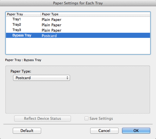 Sélectionnez [Bypass Tray], spécifiez le type de papier correct dans [Paper Type:], puis cliquez sur [OK].