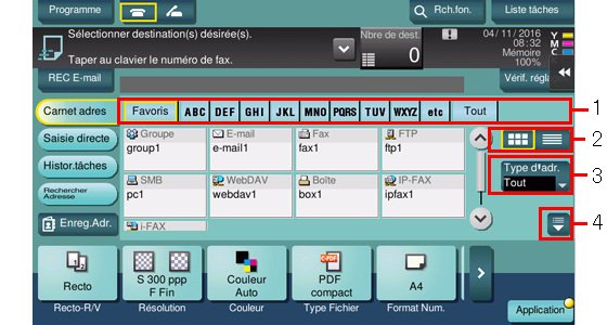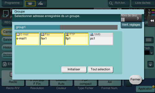 Lorsqu'un groupe est sélectionné dans [Carnet adres], sélectionnez la destination à laquelle vous souhaitez envoyer des données parmi les destinations enregistrées dans le groupe. S'il y a dans les destinations enregistrées dans le groupe une destination qui n'est pas souhaitée pour l'envoi des données, tapez [Tout sélection], puis tapez sur la destination pour la désélectionner.