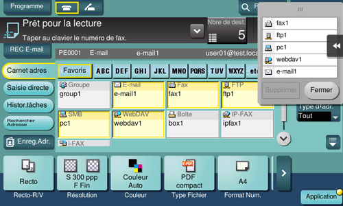 Pour afficher la liste des destinations de diffusion et vérifier ou supprimer les destinations spécifiées, spécifiez plusieurs destinations et tapez sur [Nbre de dest.] Vous pouvez déplacer l'emplacement d'affichage de la liste en faisant glisser le haut de la liste.