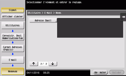 Tapez sur [Utilitaires] - [Enregistrement Boîte/Destinat.] - [Enregistr. Dest Numérisation/Fax] - [Carnet Adresses (Public)] - [E‑mail] - [Nouveau].