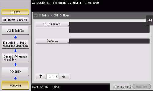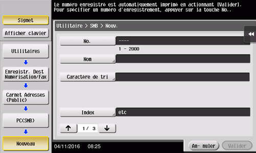 Tapez sur [Utilitaires] - [Enregistrement Boîte/Destinat.] - [Enregistr. Dest Numérisation/Fax] - [Carnet Adresses (Public)] - [PC(SMB)] - [Nouveau].