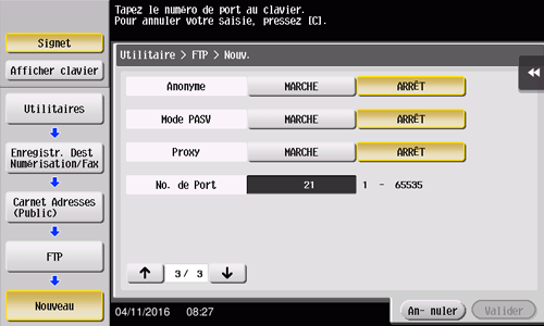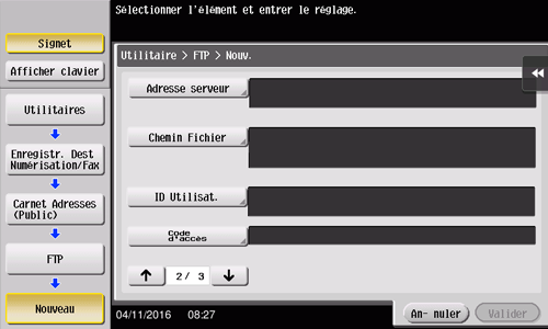 Tapez sur [Utilitaires] - [Enregistrement Boîte/Destinat.] - [Enregistr. Dest Numérisation/Fax] - [Carnet Adresses (Public)] - [FTP] - [Nouveau].