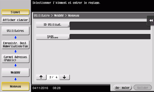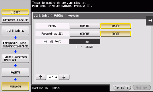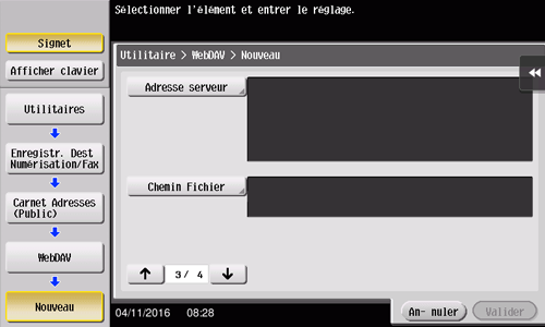 Tapez sur [Utilitaires] - [Enregistrement Boîte/Destinat.] - [Enregistr. Dest Numérisation/Fax] - [Carnet Adresses (Public)] - [WebDAV] - [Nouveau].