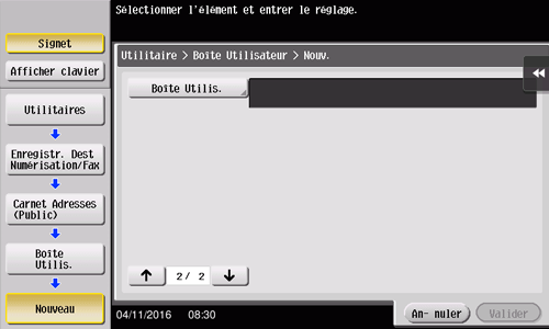 Tapez sur [Utilitaires] - [Enregistrement Boîte/Destinat.] - [Enregistr. Dest Numérisation/Fax] - [Carnet Adresses (Public)] - [Boîte Utilis.] - [Nouveau].
