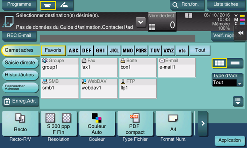 Au besoin, vous pouvez modifier l'affichage de l'écran principal du mode fax/numérisation (par défaut : [Carnet adres]). Pour plus de détails, voir [Onglet par Défaut] .Spécifiez le format de l'original à numériser.