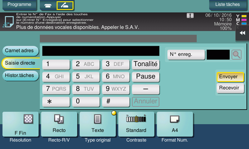 Les numéros de fax peuvent être spécifiés depuis [Carnet adres], [Saisie directe], [Histor.tâches] ou [Programme]. Pour des détails sur la spécification d'une destination, voir [Spécifier une destination] . Pour des détails sur le mode de spécification d'un programme de télécopie/numérisation, voir [Envoyer un fax par rappel d'un programme] .