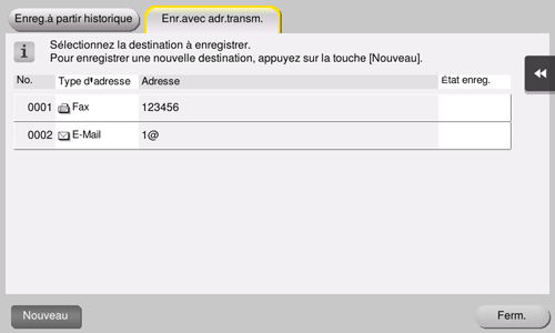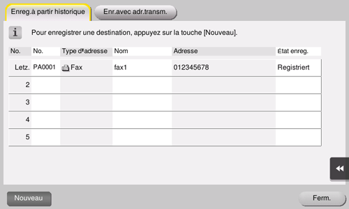 Tapez sur [Nouveau] pour enregistrer une nouvelle adresse qui n'est pas encore saisie. Pour des détails sur l'enregistrement, voir [Enregistrer depuis l'écran de base Fax/Numérisation ] .Entrez le nom d'enregistrement pour la destination.