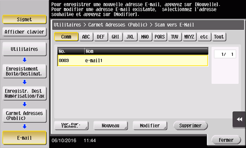 Tapez sur [Utilitaire] - [Enregistement Boîte/Destinat.] - [Enregistr. Dest Numérisation/Fax] - [Carnet Adresses (Public)].
