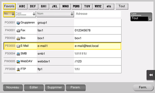 Pour une destination fréquemment utilisée, sélectionnez également [Favoris]. Si [Favoris] est sélectionné, la destination apparaîtra dans l'écran principal du mode Fax/Numérisation, permettant ainsi à l'utilisateur de sélectionner facilement une destination.