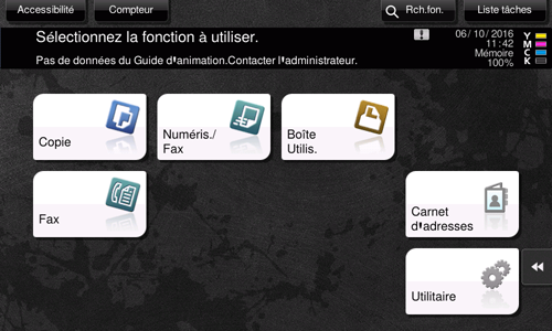 Pour utiliser le mode fax, insérez la touche de raccourci [Fax] dans le menu principal. Pour des détails sur l'insertion d'une touche de raccourci dans le menu principal, voir [Menu principal] .