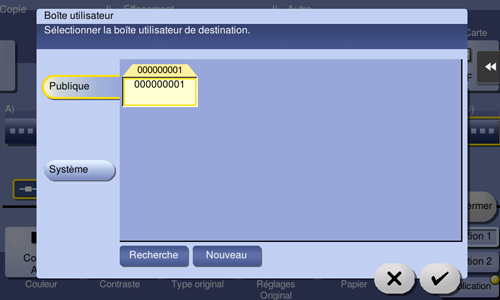 Pour enregistrer l'original dans une boîte utilisateur [Publique], [Perso] ou [Groupe], tapez sur Publique, Perso ou Groupe et sélectionnez la boîte de destination. Tapez sur [Nouveau] et entrez un nouveau numéro de boîte utilisateur pour enregistrer la boîte de destination.