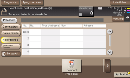 Pour les besoins de l'historique, les dernières tâches (cinq max.) sont affichées. Vous pouvez aussi sélectionner plusieurs destinations dans l'historique.