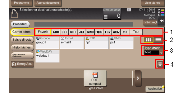 2 | Bascule l'affichage des destinations enregistrées vers le mode Bouton ou Vue Liste. Si vous sélectionnez le mode Vue liste, vous pouvez trier les destinations par numéro d'enregistrement, type de destination ou nom enregistré. |