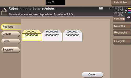 Cet exemple utilise la boîte utilisateur public pour les explications. Pour utiliser une boîte utilisateur privé ou une boîte Groupe, tapez sur [Perso] ou [Groupe] et sélectionnez la boîte désirée.
