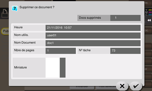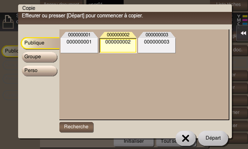 Sélectionnez un fichier, puis tapez sur [Copie]. Vous pouvez maintenant copier le fichier dans une autre boîte utilisateur. Sélectionnez la destination boîte utilisateur Publique, Perso ou Groupe. Sélectionnez une boîte utilisateur de destination, puis tapez sur [Départ] ou appuyez sur la touche Départ.