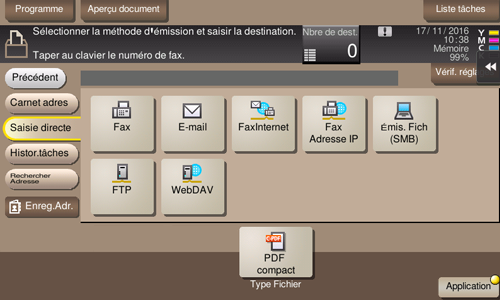 Il est possible d'envoyer des données par émission en diffusion, si vous sélectionnez plusieurs destinations. Vous pouvez également utiliser l'émission en diffusion en combinant différents modes d'envoi tels que Numériser vers e-mail et SMB Send.