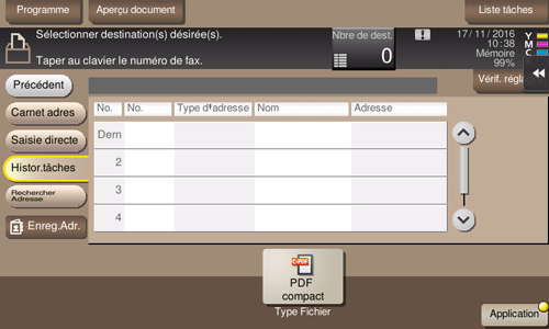 Tapez sur [Histor. tâches], puis sélectionnez une destination depuis l'historique des numérisations ou des tâches archivées.