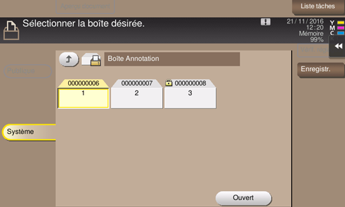 Pour plus de détails, voir [Enregistrer les originaux dans la boîte de cette machine (Enreg. ds Boîte Util)] .