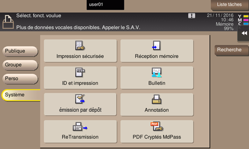 Le fait de sélectionner [Déconnexion après impression] active l'authentification ainsi que l'impression de tous les fichiers des utilisateurs correspondants stockés dans la boîte utilisateur ID & Imprimer à imprimer mais ne permet pas la connexion à cette machine.