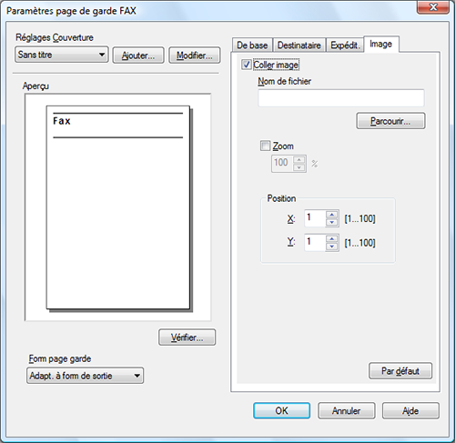 Quand vous cliquez sur [Ajouter...], l'image de la page de garde est enregistrer et vous pouvez la rappeler plus tard en sélectionnant [Paramètres page de garde FAX].Cliquer sur [OK].