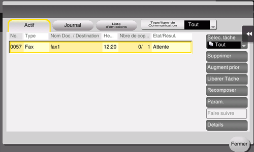 une émission fax qui a échoué constitue une tâche réservée en attente de renvoi (recomposition).