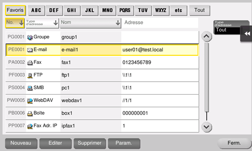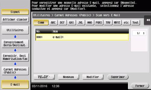 Tapez sur [Utilitaire] - [Enregistement Boîte/Destinat.] - [Enregistr. Dest Numérisation/Fax] - [Carnet Adresses (Public)].