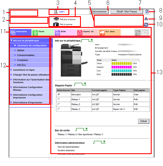 Cet exemple illustre les éléments figurant dans [Information] - [Info sur le périphérique] afin d'expliquer les sections qui se trouvent dans chaque écran.